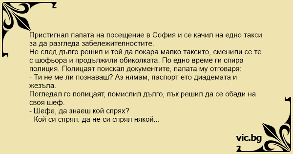 Не след дълго решил и той да покара малко таксито, сменили се те с шофьора и продължили обиколката. По едно време ги спира полиция. Полицаят поискал документите, папата му отговаря: