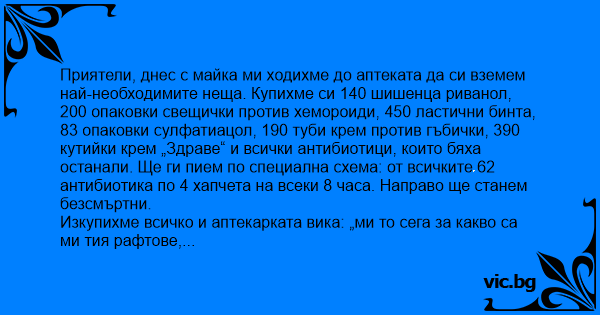 Приятели, днес с майка ми ходихме до аптеката да си вземем най-необходимите неща. Купихме си 140 шишенца риванол, 200 опаковки свещички против хемороиди, 450 ластични бинта, 83 опаковки сулфатиацол, 190 туби крем против гъбички, 390 кутийки крем „Здраве“ и всички антибиотици, които бяха останали. Ще ги пием по специална схема: от всичките 62 антибиотика по 4 хапчета на всеки 8 часа. Направо ще станем безсмъртни.