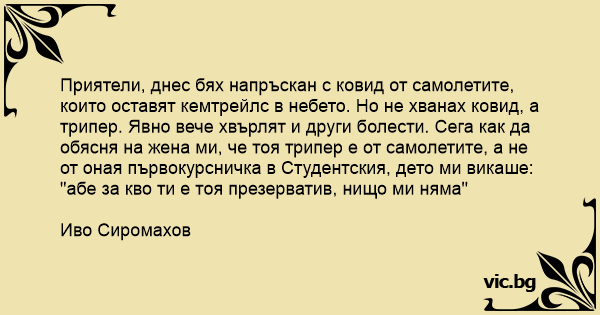 Приятели, днес бях напръскан с ковид от самолетите, които оставят кемтрейлс в небето. Но не хванах ковид, а трипер. Явно вече хвърлят и други болести. Сега как да обясня на жена ми, че тоя трипер е от самолетите, а не от оная първокурсничка в Студентския, дето ми викаше: "абе за кво ти е тоя пpeзepbatиb, нищо ми няма"