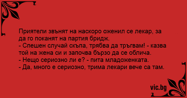 Приятели звънят на наскоро оженил се лекар, за да го поканят на партия бридж.