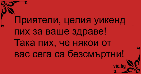 Приятели, целия уикенд пих за ваше здраве! Така пих, че някои от вас сега са безсмъртни!