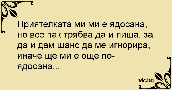 Приятелката ми ми е ядосана, но все пак трябва да и пиша, за да и дам шанс да ме игнорира, иначе ще ми е още по-ядосана...
