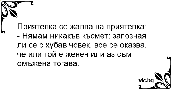 - Нямам никакъв късмет: запозная ли се с хубав човек, все се оказва, че или той е женен или аз съм омъжена тогава.