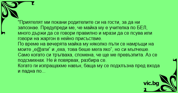 "Приятелят ми покани родителите си на гости, за да ни запознае. Предупреди ме, че майка му е учителка по БЕЛ, много държи да се говори правилно и мрази да се псува или говори на жаргон в нейно присъствие.