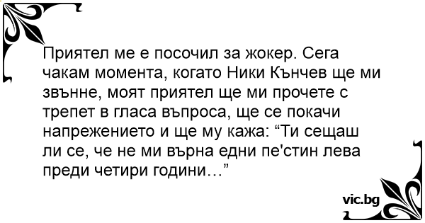 Приятел ме е посочил за жокер. Сега чакам момента, когато Ники Кънчев ще ми звънне, моят приятел ще ми прочете с трепет в гласа въпроса, ще се покачи напрежението и ще му кажа: “Ти сещаш ли се, че не ми върна едни пе'стин лева преди четири години…”