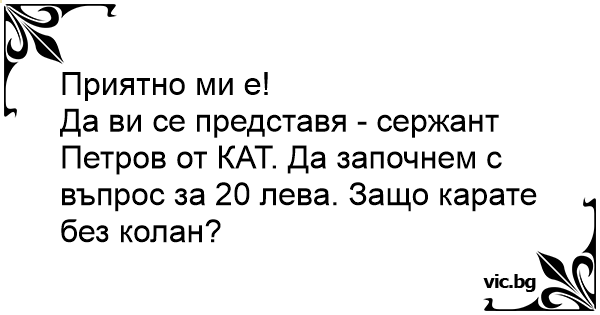 Да ви се представя - сержант Петров от КАТ. Да започнем с въпрос за 20 лева. Защо карате без колан?
