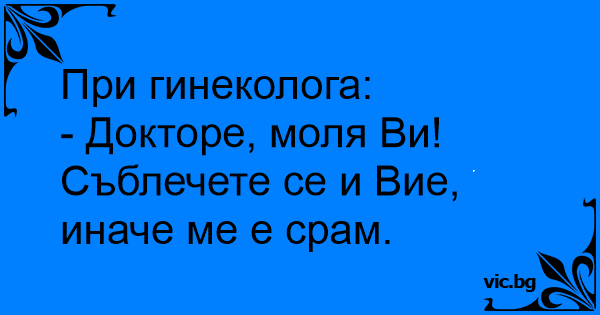 При гинеколога: - Докторе, моля Ви! Съблечете се и Вие, иначе ме е срам.