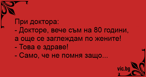 - Докторе, вече съм на 80 години, а още се заглеждам по жените!