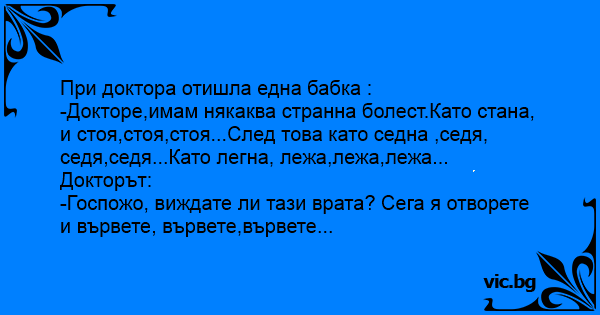 -Докторе,имам някаква странна болест.Като стана, и стоя,стоя,стоя...След това като седна ,седя, седя,седя...Като легна, лежа,лежа,лежа...