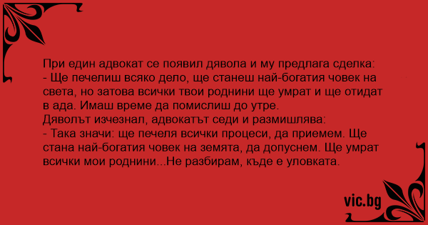 - Ще печелиш всяко дело, ще станеш най-богатия човек на света, но затова всички твои роднини ще умрат и ще отидат в ада. Имаш време да помислиш до утре.