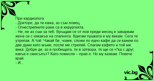 - Слушай де, докторе. Миналата седмица се връщам от лов, те двамата пак. Вдигам пушката и викам: Сега нея ще утрепам. А онзи: Чакай бе, човек, сложи по едно кафе, да си кажем по две думи и после стреляй. Слагам кафето и той: Ти в затвора, тя в гробищата, аз че си чуkam друга. Какъв е смисълът? Прав е, но викам: Повече край!