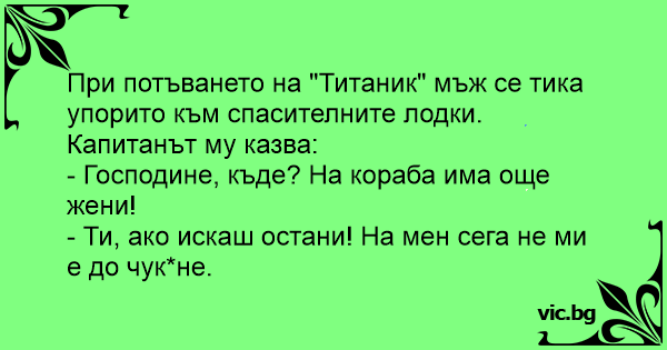 При потъването на "Титаник" мъж се тика упорито към спасителните лодки. Капитанът му казва: