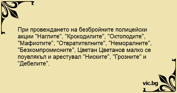 При провеждането на безбройните полицейски акции "Наглите", "Крокодилите", "Октоподите", "Мафиотите", "Отвратителните", "Неморалните", "Безкомпромисните", Цветан Цветанов малко се поувлякъл и арестувал "Ниските", "Грозните" и "Дебелите".