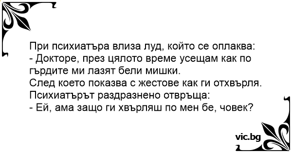- Докторе, през цялото време усещам как по гърдите ми лазят бели мишки.
