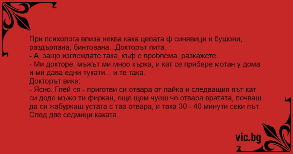 При психолога влиза неква кака целата ф синявици и бушони, раздърпана, бинтована...Докторът пита.