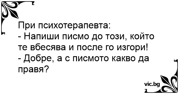 Трпана на психијатар: - Значи премногу бес има во тебе. Напиши писмо до тој што те нервира, искажи се и после запали го. - Ок. А со писмото што да правам?