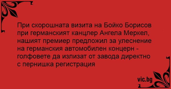 При скорошната визита на Бойко Борисов при германският канцлер Ангела Меркел, нашият премиер предложил за улеснение на германския автомобилен концерн - голфовете да излизат от завода директно с пернишка регистрация