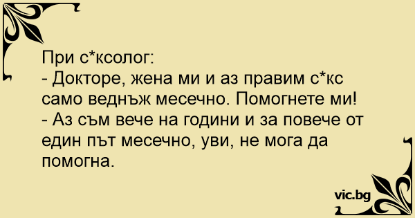 - Докторе, жена ми и аз правим cekc само веднъж месечно. Помогнете ми!