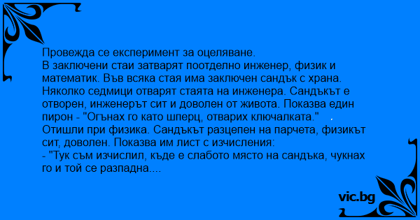 В заключени стаи затварят поотделно инженер, физик и математик. Във всяка стая има заключен сандък с храна. Няколко седмици отварят стаята на инженера. Сандъкът е отворен, инженерът сит и доволен от живота. Показва един пирон - "Огънах го като шперц, отварих ключалката."