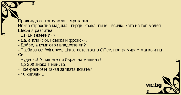 • Вицове от Facebook от нашата страница https://www.facebook.com/www.vic.bg
