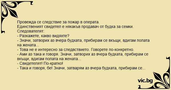 - Така и говоря, бе! Значи, затварям аз вчера будката, прибирам се вкъщи, вдигам полата на жената, която виси на прозореца и какво мислите виждам? Операта гори!