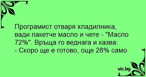 Програмист отваря хладилника, вади пакетче масло и чете - "Масло 72%". Връща го веднага и казва: