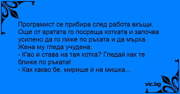 Програмист се прибира след работа вкъщи. Още от вратата го посреща котката и започва усилено да го лиже по ръката и да мърка.
