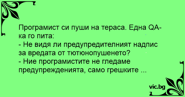 Програмист си пуши на тераса. Една QA-ка го пита: