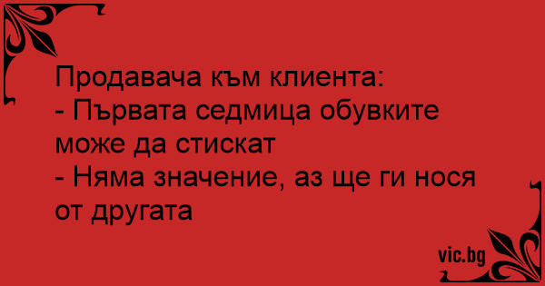 Verkoopster: "De eerste dagen zullen de schoenen wel een beetje knellen." Klant: "Geeft niet, Ik doe ze toch pas over een week aan!"