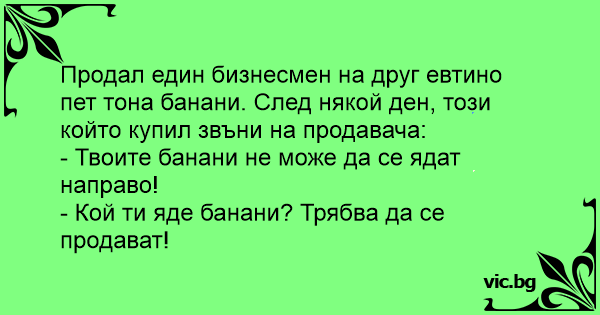Продал един бизнесмен на друг евтино пет тона банани. След някой ден, този който купил звъни на продавача: