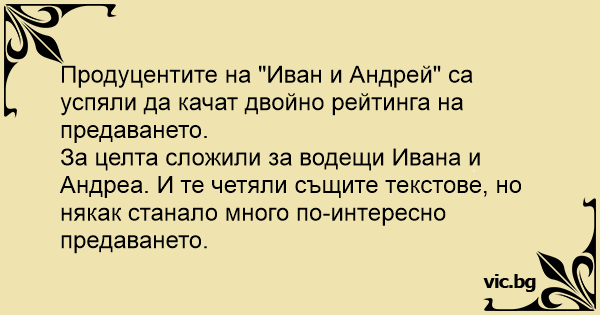За целта сложили за водещи Ивана и Андреа. И те четяли същите текстове, но някак станало много по-интересно предаването.
