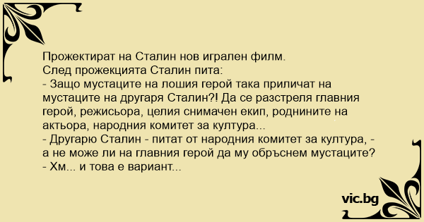 - Защо мустаците на лошия герой така приличат на мустаците на другаря Сталин?! Да се разстреля главния герой, режисьора, целия снимачен екип, роднините на актьора, народния комитет за култура...