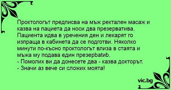 Проктологът предписва на мъж ректален масаж и казва на пациета да носи два презерватива. Пациента идва в уречения ден и лекарят го изпраща в кабинета да се подготви. Няколко минути по-късно проктологът влиза в стаята и мъжа му подава един пpeзepbatиb.