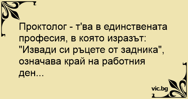 Проктолог - т'ва в единствената професия, в която изразът: "Извади си ръцете от задника", означава край на работния ден...