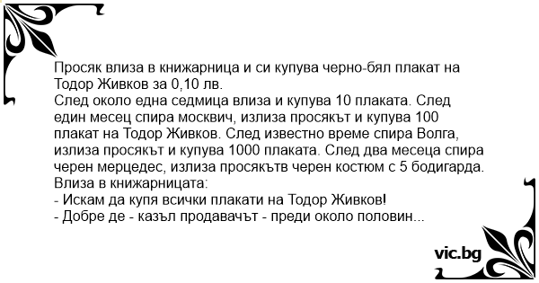 - Добре де - казъл продавачът - преди около половин година бяхте просяк. От тогава идвате и ми купувате плакати на Тодор Живков и забогатяхте. Как стана това?