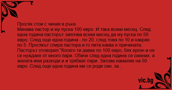 Минава пастор и му пуска 100 евро. И така всеки месец. След една година пасторът започва всеки месец да му пуска по 50 евро. След още една година - по 20, след това по 10 и накрая по 5. Просякът спира пастора и го пита каква е причината. Пасторът отоворил:"Когато ти давах по 100 евро, бях ерген и не се нуждаех от много пари. Обаче след една година се ожених, а жената има разходи и и трябват пари. Затова намалих на 50 евро. След още една година ми се роди син, за когото също трябват пари, затова ти намалих на 20 евро. След още една година ми се роди дъщеря и ето ти 10 евро..".