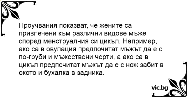 Проучвания показват, че жените са привлечени към различни видове мъже според менструалния си цикъл. Например, ако са в овулация предпочитат мъжът да е с по-груби и мъжествени черти, а ако са в цикъл предпочитат мъжът да е с нож забит в окото и бухалка в задника.