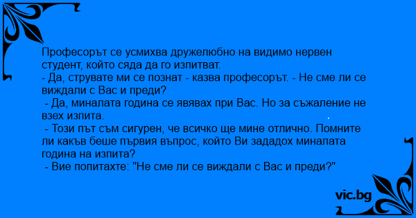 Професорът се усмихва дружелюбно на видимо нервен студент, който сяда да го изпитват. - Да, струвате ми се познат - казва професорът. - Не сме ли се виждали с Вас и преди? - Да, миналата година се явявах при Вас. Но за съжаление не взех изпита. - Този път съм сигурен, че всичко ще мине отлично. Помните ли какъв беше първия въпрос, който Ви зададох миналата година на изпита? - Вие попитахте: "Не сме ли се виждали с Вас и преди?"