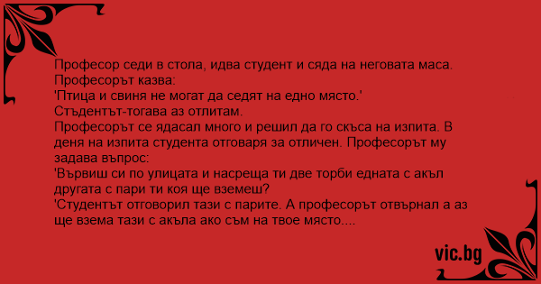'Студентът отговорил тази с парите. А професорът отвърнал а аз ще взема тази с акъла ако съм на твое място.