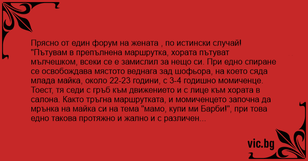 "Пътувам в препълнена маршрутка, хората пътуват мълчешком, всеки се е замислил за нещо си. При едно спиране се освобождава мястото веднага зад шофьора, на което сяда млада майка, около 22-23 години, с 3-4 годишно момиченце. Тоест, тя седи с гръб към движението и с лице към хората в салона. Както тръгна маршрутката, и момиченцето започна да мрънка на майка си на тема "мамо, купи ми Барби!", при това едно такова протяжно и жално и с различен тон всеки път. Майка и и влезе в ритъма и и отговаряше с "за какво ти е Барби, имаш си вече три, по-добре да ти купя нещо друго" и т.н. Всичкото това мрънкане и виене почна да омръзва не само на мен, но и на останалите пътници. След няколко спирки стратегията на момиченцето се промени. Тя изведнъж стана важна и млъкна, като видимо се сети за нещо коварно. И след още една спирка се издаде: