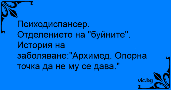 Отделението на "буйните". История на заболяване:"Архимед. Опорна точка да не му се дава."