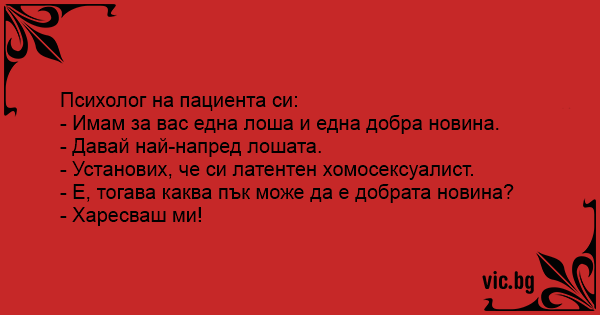 Психолог разговара со својот пациент и му вели: - Имам една лоша и една добра вест за тебе! - Ајде кажи ја прво лошата? - Заклучив дека ти си хомосексуалец! - А добрата?! - Ми се допаѓаш!