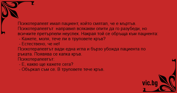 Психотерапевт имал пациент, който смятал, че е мъртъв. Психотерапевтът направил всякакви опити да го разубеди, но всичките претърпели неуспех. Накрая той се обръща към пациента: