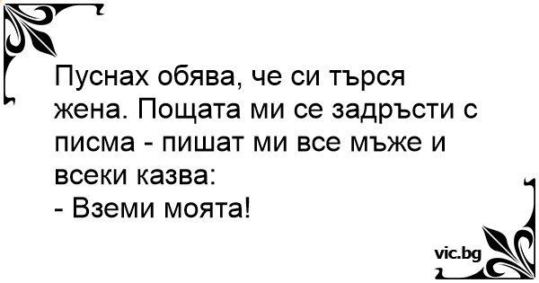 En single mand satte en kontaktannonce i avisen med teksten: Kone søges. Dagen efter modtog han flere hundrede breve - alle med det samme svar: Du må meget gerne få min.