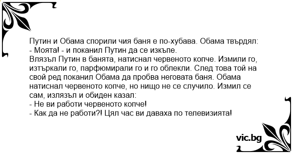 Влязъл Путин в банята, натиснал червеното копче. Измили го, изтъркали го, парфюмирали го и го облекли. След това той на свой ред поканил Обама да пробва неговата баня. Обама натиснал червеното копче, но нищо не се случило. Измил се сам, излязъл и обиден казал: