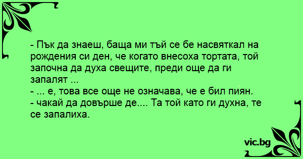 - Пък да знаеш, баща ми тъй се бе насвяткал на рождения си ден, че когато внесоха тортата, той започна да духа свещите, преди още да ги запалят ...