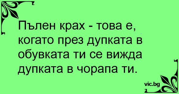 Пълен крах - това е, когато през дупката в обувката ти се вижда дупката в чорапа ти.