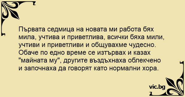 Първата седмица на новата ми работа бях мила, учтива и приветлива, всички бяха мили, учтиви и приветливи и общувахме чудесно.