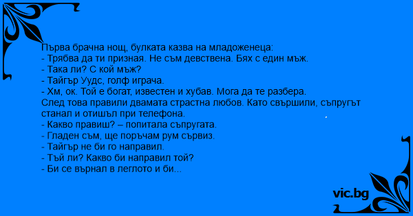 Първа брачна нощ, булката казва на младоженеца: