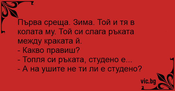Първа среща. Зима. Той и тя в колата му. Той си слага ръката между краката й.